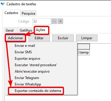 Cadastro de Tarefas >> Ações >> Adicionar >> Exportar conteúdo do sistema
