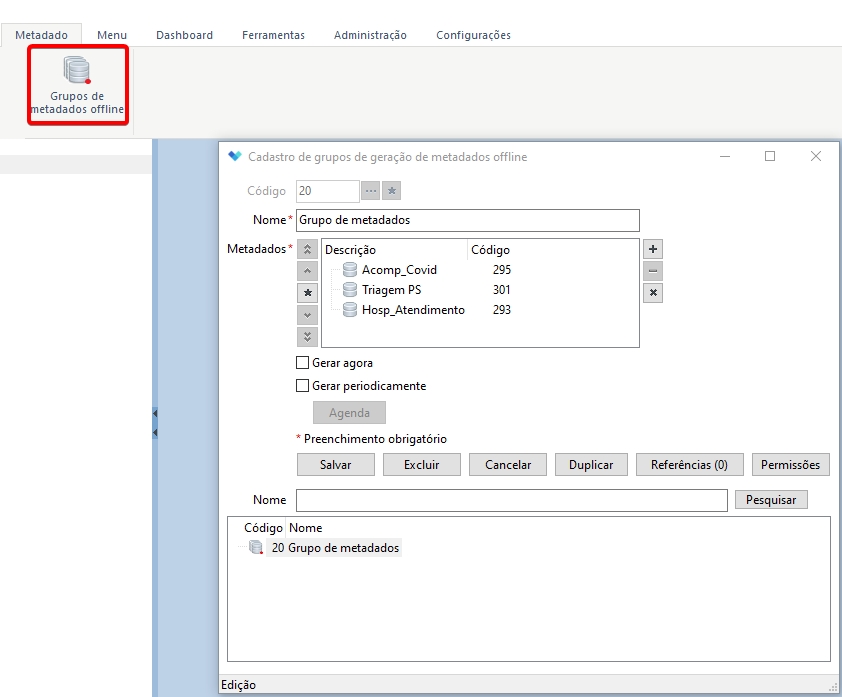Ao acessar a aba "Metadados", é possível criar grupos de metadados offline, onde diversos metadados podem ser agrupados. Esses grupos podem ser programados para serem gerados de acordo com o horário da agenda ou podem ser selecionados para geração imediata.