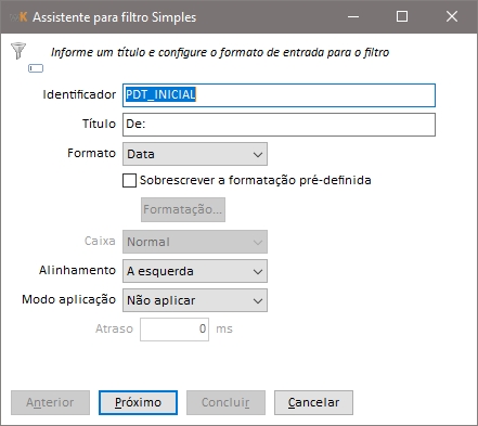 Indique o nome identificador, Título, Tipo do campo do filtro em questão, e alinhamento. Clique em PROXIMO;