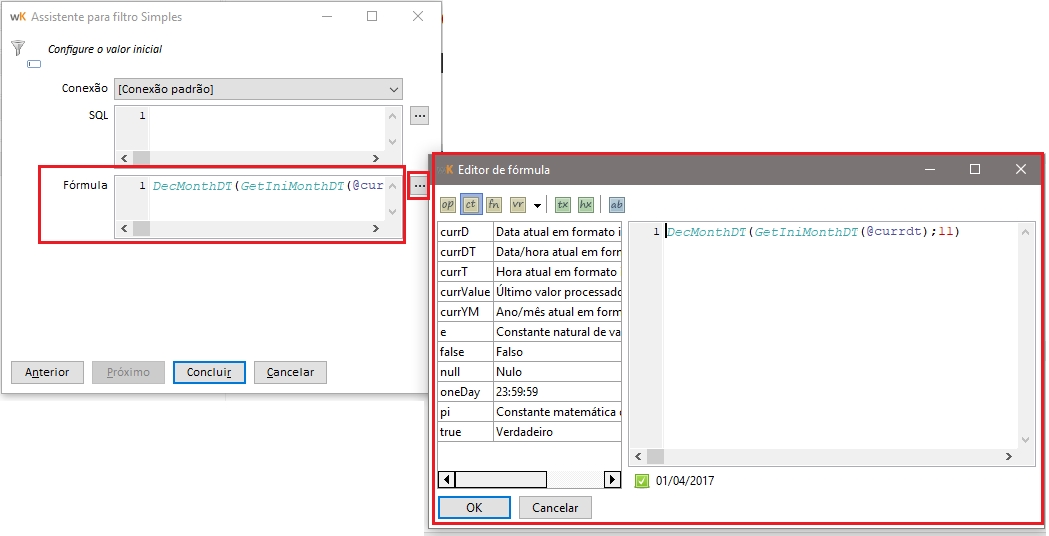 Na sequência, é possível parametrizar um valor inicial, vindo de uma consulta SQL, ou através de fórmulas, onde pode-se indicar valores fixos ou utilizando Variáveis ou Funções da ferramenta de fórmula do Weknow.