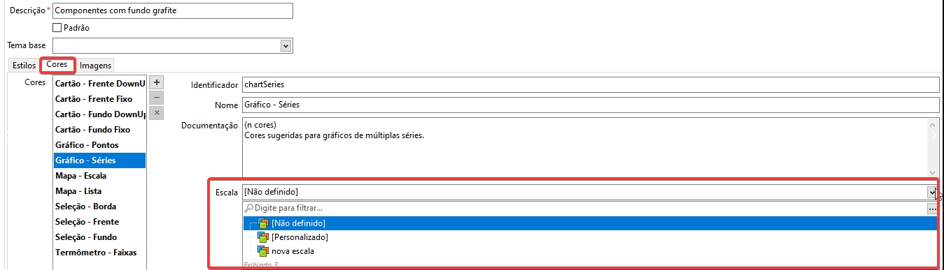 Na área de Escala de Cores, as seleções ficam cadastradas e disponíveis a todas as possibilidades de peculiaridades de cores nos objetos componentes de indicadores.