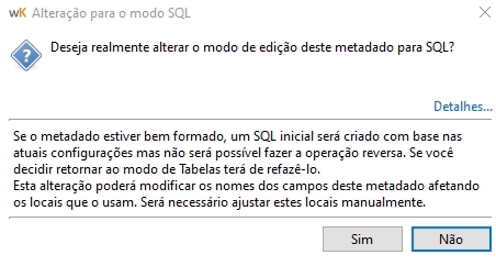 Ao alterar o metadado do modo tabela para SQL: