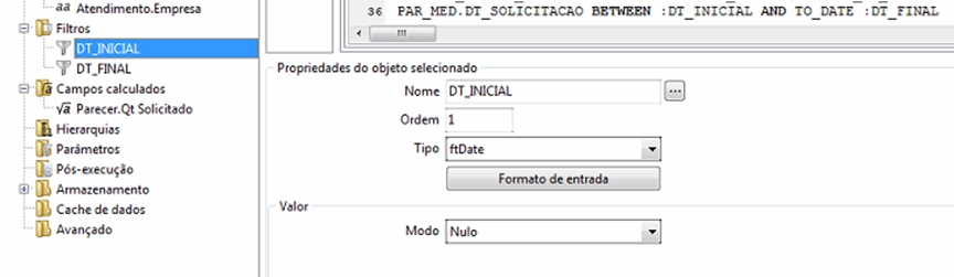 Neste exemplo, foi definido um filtro de data inicial e data final no sql do metadado , na linha “WHERE BETWEEN :DT_INICIAL AND :DT_FINAL”