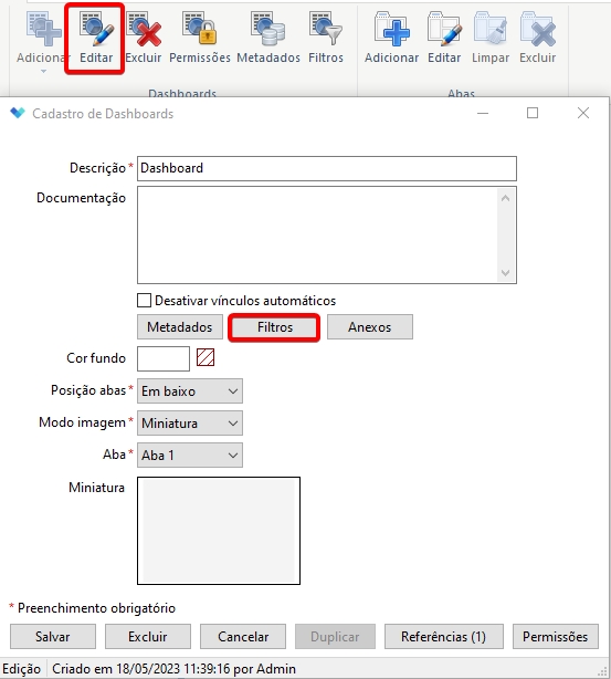 Esta tela está localizada na Aba Menu no botão “Editar” ou “Filtro”, conforme apresentado abaixo.