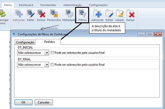 Na tela de Filtros , serão apresentados duas Abas. Aba “Configuração” ( padrão do Weknow) e a aba referente ao metadado que possui filtros no sql. Na imagem abaixo é a aba “ Pedidos ”.