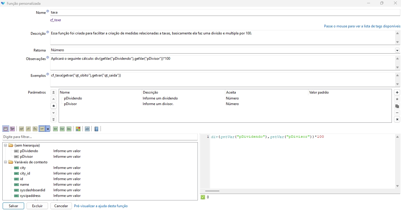 Um exemplo poderia criar uma função chamada, por exemplo, Taxa que aceitaria 2 parâmetros Dividendo e Divisor com a fórmula: