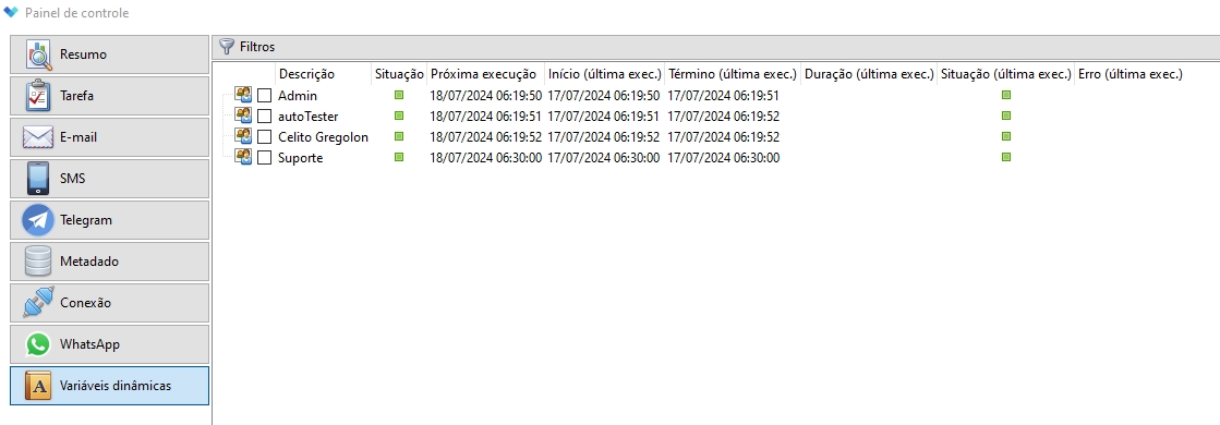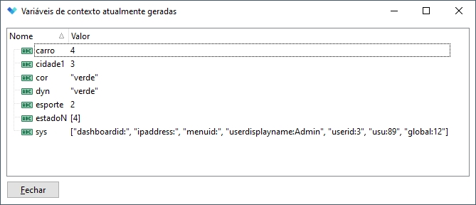 A opção Ver as variáveis atualmente geradas abre uma tela exibindo as variáveis dinâmicas que foram geradas para o usuário.