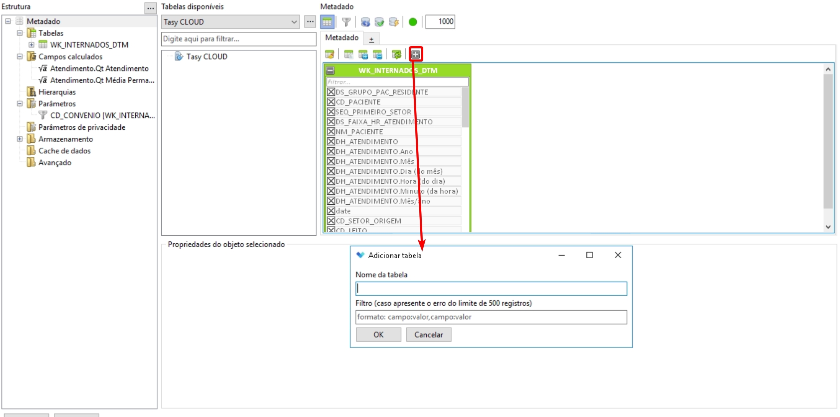 Após criar a nova conexão, acesse o editor de metadados e selecione a conexão criada. Em seguida, você poderá adicionar o modelo/tabela criado no Tasy. Após informar o nome e clicar em “OK”, todas as informações do modelo/tabela serão transferidas para o metadado.