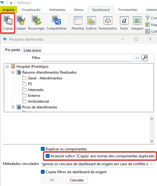 Agora ao copiar um dashboard, você poderá escolher se deseja adicionar o sufixo '(Cópia)' no nome de cada componente.