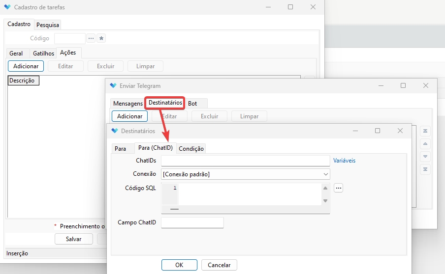 Agora ao criar uma tarefa para "Enviar Telegram", será possível configurar o ChatID no campo de destinatário. Dessa forma, não será necessário informar o número do destinatário.