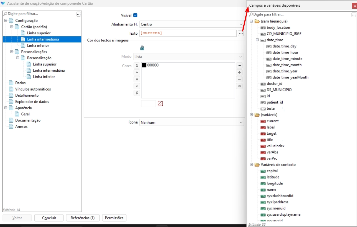Para ampliar as possibilidades de criação de cartões, foram adicionadas novas variáveis relacionadas ao componente e ao metadado, além das já existentes. Essa implementação permite explorar uma variedade de novos cenários, incluindo a utilização de variáveis provenientes de campos calculados, viabilizando configurações mais dinâmicas e personalizadas.