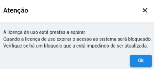 Agora ao acessar o Weknow, será exibida uma mensagem apenas se a licença estiver próxima de expirar, informando a necessidade de atualização para evitar interrupções no serviço.
