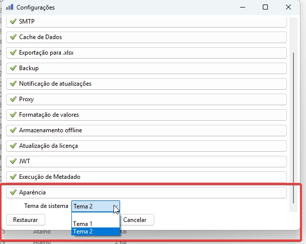 Após ajustar as configurações de aparência, acesse a seção "Temas" no Weknow e, em "Tema Base", selecione o tema do sistema.
